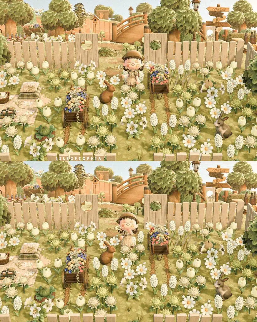 This island theme idea from @isleofsoph puts some white flowers inside Vertical-Board Fences. Add in a couple of Garden Wagons, Bunny Garden Decorations, and a small picnic area. Your flower garden will end up looking quite charming. You can find more acnh garden design ideas here.
