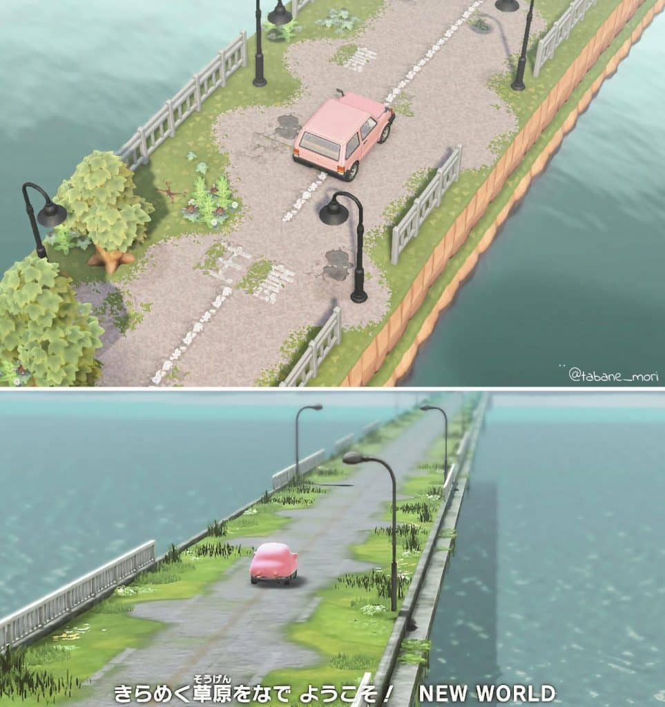 With a pink Minicar, some curved Streetlights, a bit of land terraforming, and Custom Designs for road and grass paths, you can have a car Kirby on your island as well!