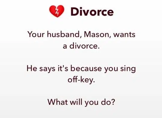 But there’s a twist – your partner has to initiate the divorce. All you can do is insult them, ignore them, cheat on them, and do whatever it takes until they ask you for a divorce.