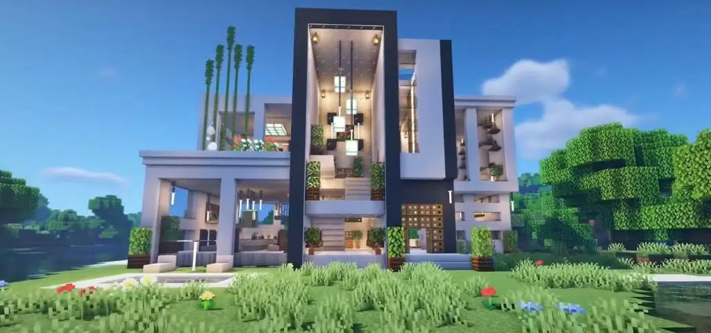 It utilizes natural blocks like leaf blocks and trees to contrast the sleek modern design but also allows it to more likely match the Minecraft world you have built already. There’s nothing worse when a building you’ve created just doesn’t quite fit into the surrounding area.