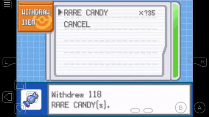 Enter the code and visit the item PC. Check Item Storage and then Withdraw item section. Select Rare Candy and the number of candies you want to withdraw.