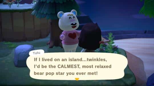 If a cheerful and adorable bear is a villager you’d like to have on your island, look no further than Tutu. She’ll definitely want to have sleepovers with you, and jam to Bubblegum K.K. all the time. It’ll be “totes adorbz”!